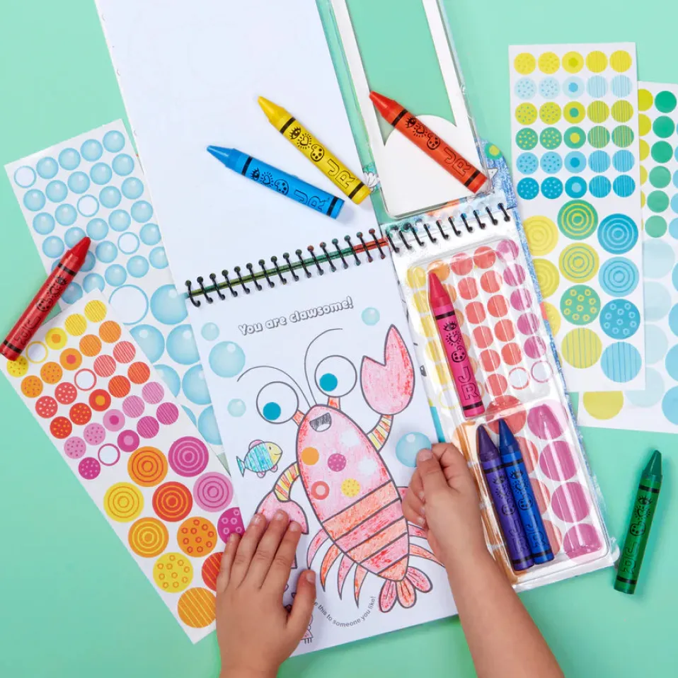 • Charming artwork features whales, sea lions, sharks and other sea creatures to fill in with crayons and colorful dot stickers!