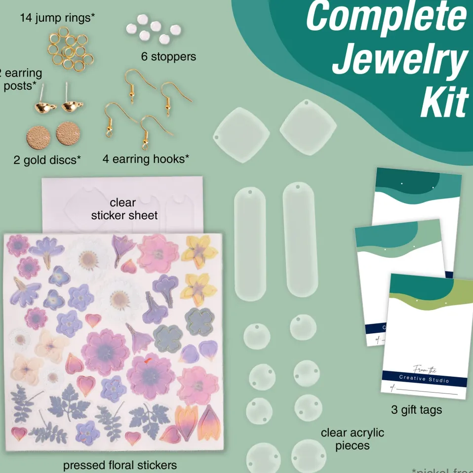 Contents Include: 12 Clear acrylic blanks, 2 Decorative Connectors, 2 Pair of wire earring hooks, 1 Pair of earring posts, 14 Jump rings, Clear and floral stickers, Clear earring backs, 2 Customizable gift tags and Instructions