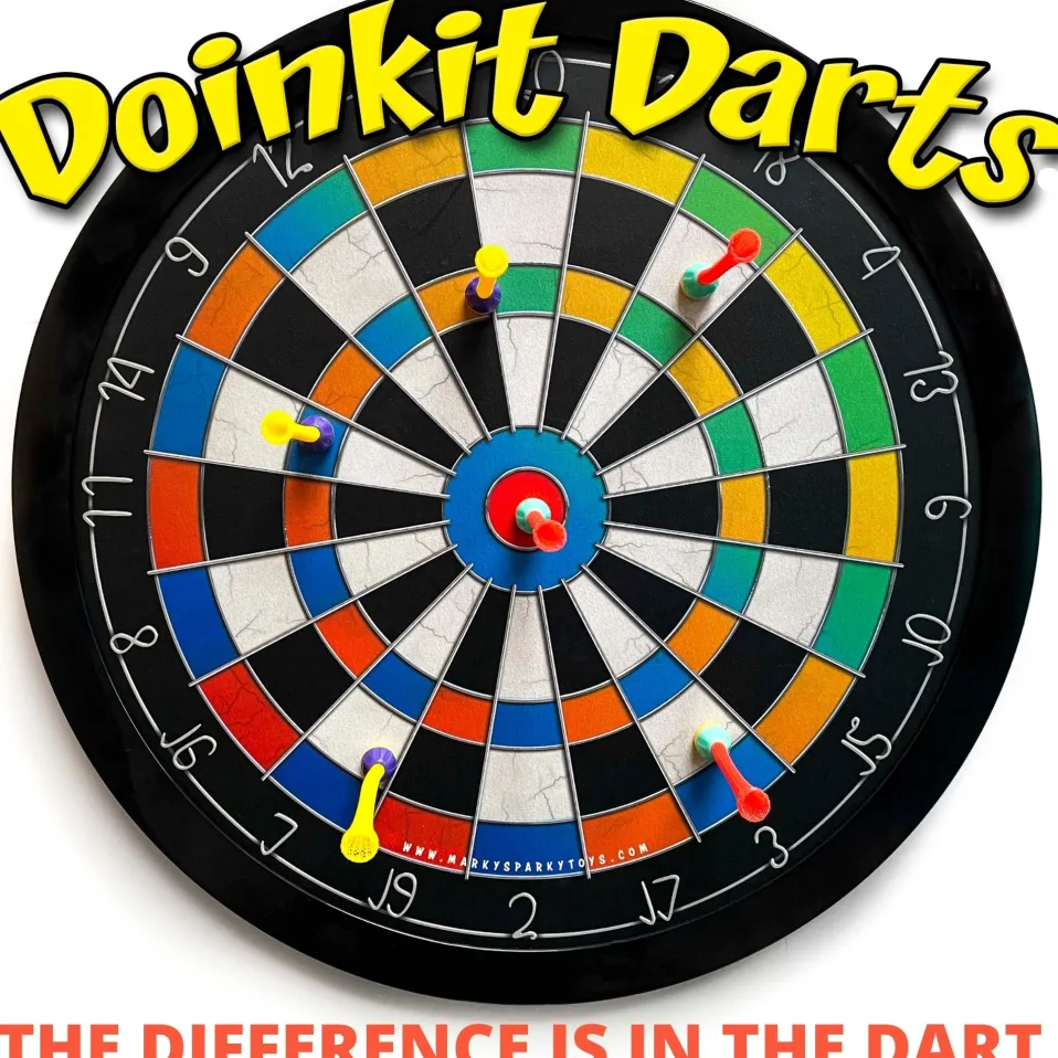 Enjoy all the fun of darts, but with magnets completely enclosed safely inside. They won’t harm walls (or hurt children)! Features all the same characteristics of the game of darts-right down to the faux cracks on the dart board. Helps improve coordination and encourages sportsmanship. A fun way to spend a family game night. Kit includes 6 lightweight magnetic darts that are safe and won’t harm walls, a dartboard with a hook on the back to hang wherever you want to play. For ages 6 and up. Has features of a real dart board, such as the size, style, and targets to give it character, but the actual darts are magnets. Dartboard comes with a hook to easily hang the board in any room Kids can learn the game of darts and play alone, with a friend or sibling, or with the whole family, in a safe way that’s also safe for the house. Size: Approx. 16″”-diam. The Doinkit Dart set was designed with one thing in mind… To develop the best playing magnetic dart set on the planet. We think we succeeded. Each of our acclaimed Doinkit Darts uses N-35 Neodymium rare earth magnets (Neodymium is a more expensive magnet than Aluminum Nickel Cobalt (Alnico) and of course much more costly than standard ceramic magnets). Combined with our space age Doinkit material that is light, durable and keeps the dart always flying perfectly true, we feel we have the perfect dart. This is the finest, most well designed and balanced magnetic dart set made at any price! Comes with 6 perfectly balanced (6.23 gms.) darts with Neodymium magnets that will work on any magnetic dartboard.