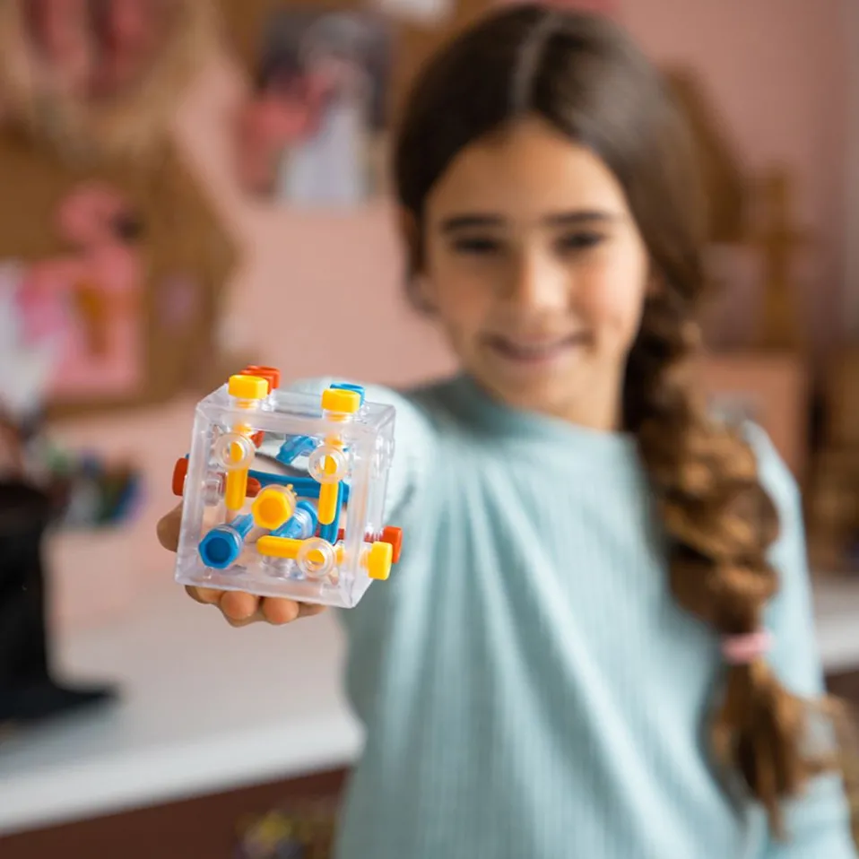 1 cube, 4 short red bolts, 4 medium yellow bolts, 5 long blue bolts, challenge booklet with 80 3D challenges and solutions.