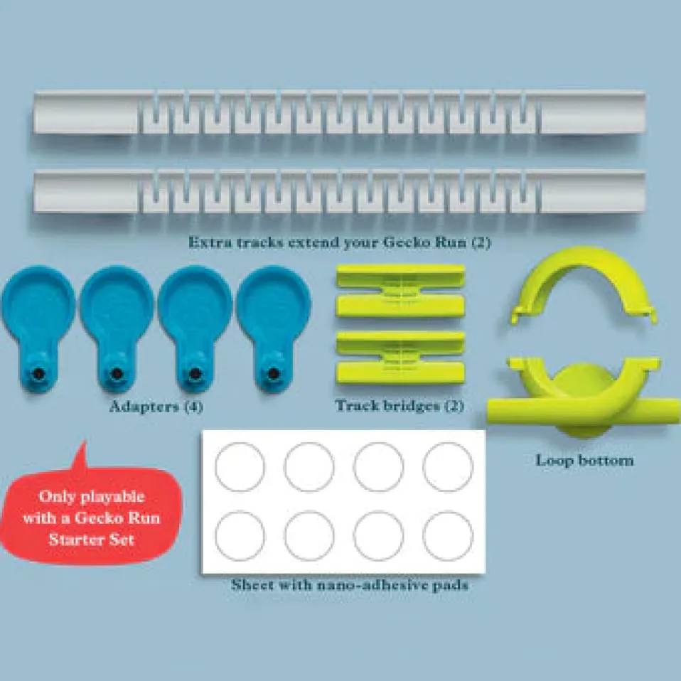 The Loop Expansion Pack comes with over a dozen pieces to complement the Gecko Run Starter Set, including a loop stunt; additional marbles and nano-adhesive pads; 2 extra tracks; and more.