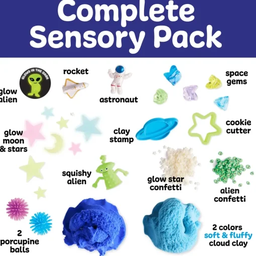 Contents Include: 2 Colors of cloud clay 0.2lb total, 1 Astronaut, 1 Rocket, 5 Space rocks, 1 Glow in the dark alien, 1 Squishy alien, 2 Porcupine space balls, 1 Star cookie cutter, 1 Saturn clay stamp, 5 Glow stars, 1 Glow moon, 1 Bag of glow in the dark star confetti, 1 Bag of alien head confetti and Instructions