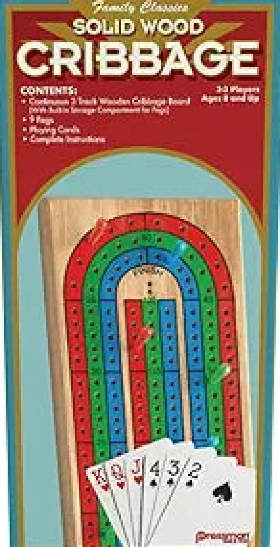 Players use card combinations to peg points along the wooden cribbage board. This handsome wooden version can be played by 2 or 3 players and folds to a handy take-anywhere size. Built-In Storage compartment is handy for storing pegs. Recommended for ages 8 and up.