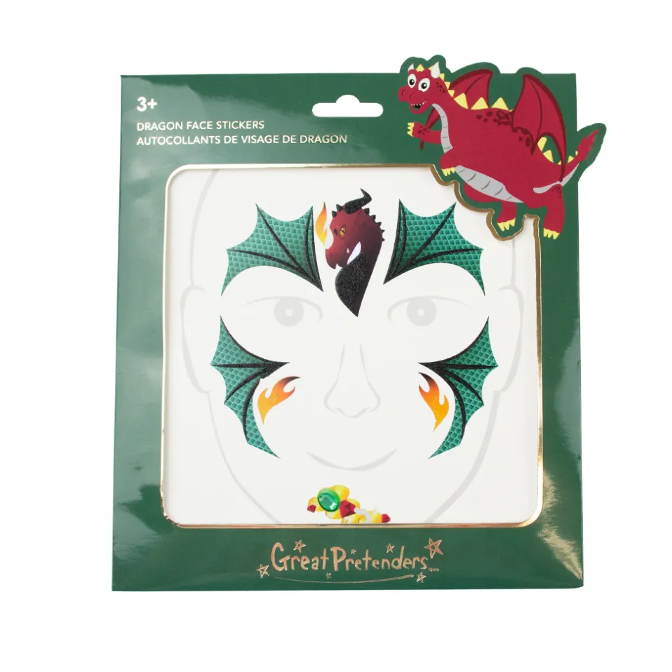 This set of 8 stickers are designed with black glitter finish & green gem accents, made to sit nicely on a child’s face. Just peel and stick to your cheeks & forehead to transform into a fiery dragon!