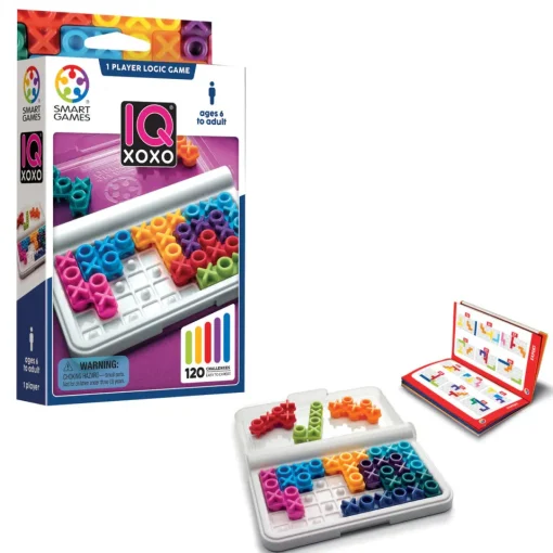 SmartGames brings hugs and kisses to the best-selling IQ series with IQ XOXO. Players are challenged fill the grid with 10 colorful, double-sided pentomino pieces, leaving X’s and O’s in sequence. Featuring 120 challenges! Includes 1 compact game board with lid, 10 puzzle pieces and 1 booklet with 120 challenges and solutions.