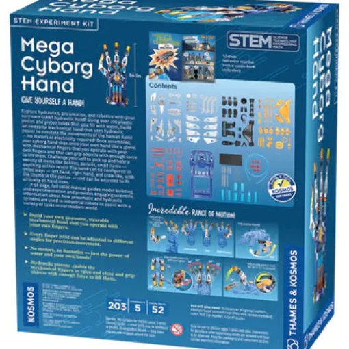 Once assembled, your cyborg hand slips onto your own hand like a glove, with mechanical fingers that you operate with your own fingers and that can grip objects with enough force to lift them. Challenge yourself to pick up and hold a variety of items like bottles, pencils, small items–anything with reach!